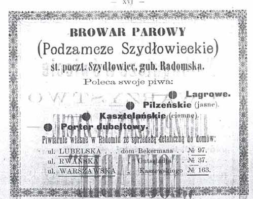 fot. Reklama prasowa szydłowieckiego browaru z przełomu XIX i XX wieku. fot. Ruiny lodowni w dawnym browarze Stumpfów (źródło; https://pl.wikimedia.org/wiki/Plik:Szydlowiec.Lodownia_04.JPG)